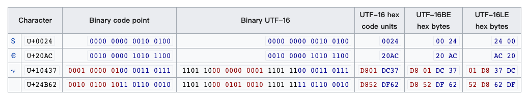 UTF-16 也是变长编码。每个 Unicode 码位由一个或两个 16 位的编码单元组成。所以一个 UTF-16 编码的字符需占用 2 或 4 字节。