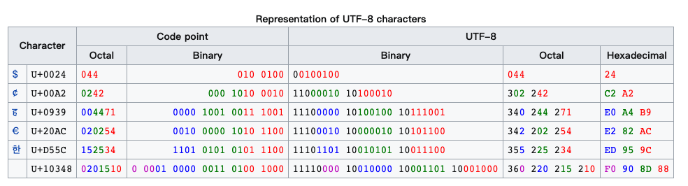 | 1 | U+0000 | U+007F | 0xxxxxxx | - | - | - | 7=8-1 |