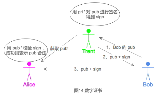 - Bob将自己的公钥pub发给Trent,请求Trent为Bob生成数字证书。