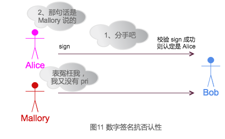 所以数字签名跟现实生活中的签名作用一样。可以做到保证你就是你,说过的话也没法抵赖。