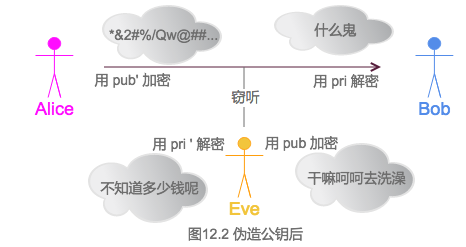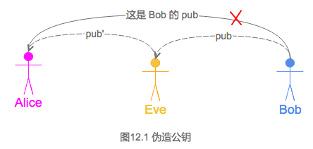 Eve伪造公钥后可以窃听Alice与Bob的通信,且Alice和Bob都不会发现被窃听。