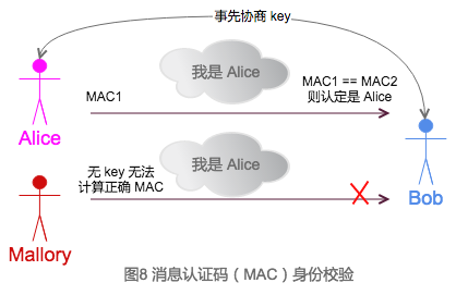 - Alice用key对msg进行计算,计算出MAC1