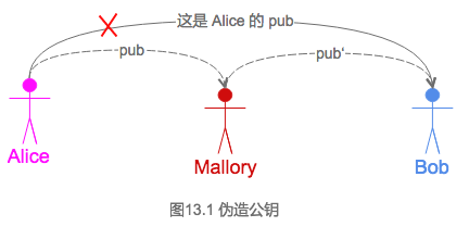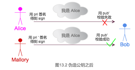 - Alice收到pub`后,认为是pub`是Bob的公钥。